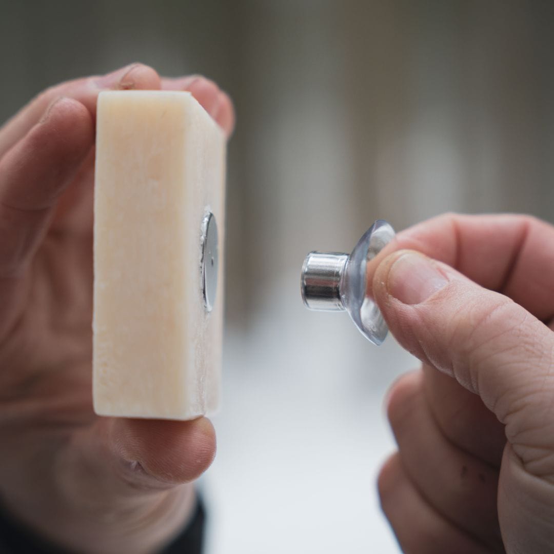 Seifenplättchen mittig in ein Stück feste Seife drücken, den Saugnapf auf eine saubere, glatte Oberfläche drücken – fertig! Zur Reinigung einfach den Magneten vom Saugnapf abziehen und mit warmem Wasser und milder Seife abspülen. Der Halter ist beliebig oft versetzbar und hinterlässt keine Spuren.
