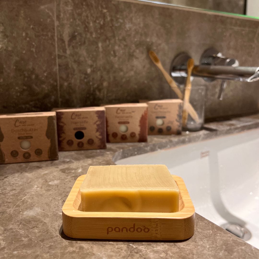 Die pandoo Bambus-Seifenschale vereint natürliche Ästhetik mit praktischer Funktion. Sie unterstützt eine bewusste, plastikfreie Pflegeroutine und schützt feste Seifen effektiv vor Feuchtigkeit. Ein langlebiger, stilvoller Begleiter für jedes nachhaltige Badezimmer – auch ideal als umweltfreundliches Geschenk oder als Ergänzung im Hotellerie- und Wellnesseinsatz.